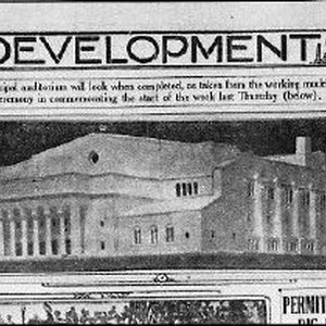 SERIES. Photo of a Sacramento Bee photo entitled "Development." This drawing shows "how the municipal auditorium will look as taken from the working model. . ."