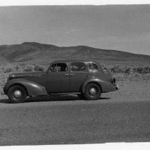 View of an automobile parked along side a road. Mountains appear in the distance.