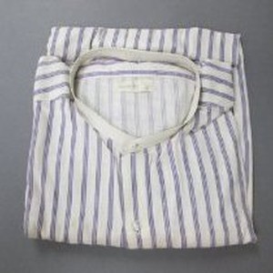 Man's white cotton shirt, with narrow purple double stripe and a dobby or faux dobby geometric pattern woven in; collarless; white shell buttons, long sleeves, French cuffs; label "Sunset"; size 16/35