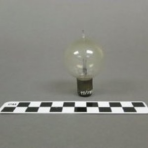 Small round light bulb with two side nails base. Glass is pointed at top.