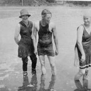 Photo--black and white: Two women and a man stand in the water at the beach at Bodega Bay. All are wearing period bathing suits, about 1919.