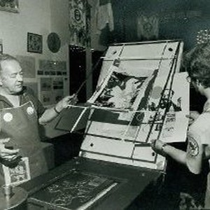 View of the printing of a poster of the Treasurers of the Sacramento History Center exhibit at the Crocker Art Museum. The two printers are not identified; photo dated July 20, 1980.