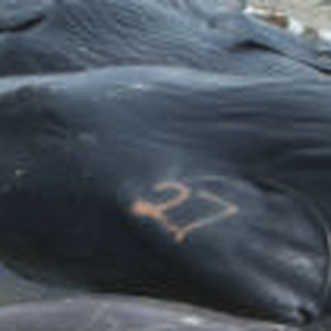 A close-up of a whale's left flipper with the number 27 painted on it.