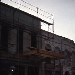 Old Sacramento. View of the Heywood Building under construction on 2nd Street, east side at the corner with J Street