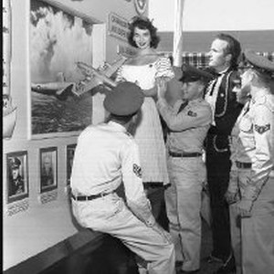SERIES. Several uniformed marching band members watch as a woman holds a model airplane in front of a large picture of the same airplane in flight. Another scanned image is of a marching band raising the American flag.