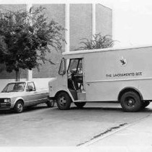 Image of Sacramento Bee truck parked at the Bee building during 1984-85 typographical union strike.