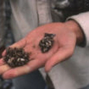 A person holding a Western gull pellet and some leaf barnacle shells.
