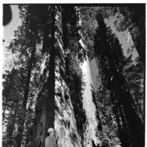 View of Calaveras Big Trees State Park in Calaveras County showing the giant redwood trees in the park. Park employees are shown in front of one of the trees