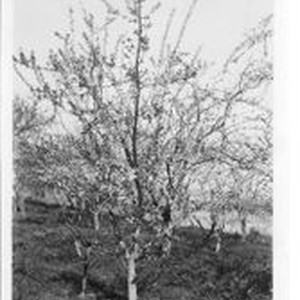 Photo, black and white: Plum tree in bloom at Gold Ridge Experiment Farm. Plum tree P-19, Golden Egg from southwest, March 19, 1929,