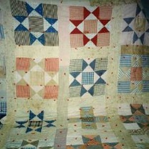 Quilt of Ohio Star pattern, multi-colored blocks, hand tied in red, layered with old quilt inside. Backing of cretonne, quilt is hand pieced and hand tied.