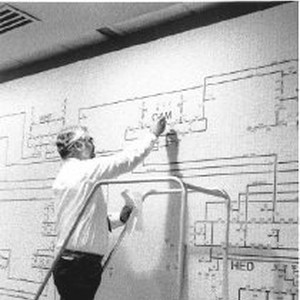 Man works with large circuit diagram posted on a wall.