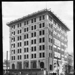 View of the new Capital National Bank under construction. The McGillivray Construction Company mounted its sign on the side of the building. Pillars can be seen on the ground floor along with more concrete on all seven floors.