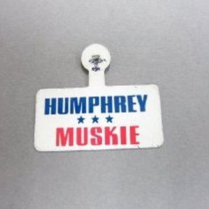 Metal tab, Blue & Red text on white background. "Humphrey Muskie"