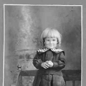SERIES. "Ted, 2 1/2 years old, 1907, while living at Perkins." Boy with dress, long blonde hair, and curls stands on chair.