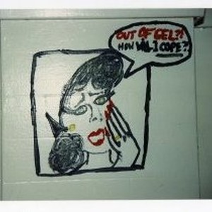 Interior view of the Merrium Apartments before demolition showing a cartoon painted on the wall of an apartment.