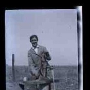 A young man pumping water from a hand pump at a farm. Original envelope marked "Quail Hunt Wilton Oct. 26, 1913 H with squirrel"
