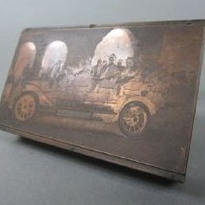 A copper intaglio printing plate mounted to a wood block depicting people in an automobile.