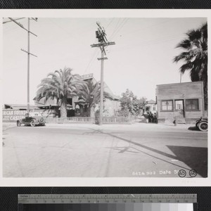 View of houses with palm trees, and automobiles on Date Street near Old Chinatown in Los Angeles. The American Foundry is at the left of the photograph. Title transcribed from photograph.