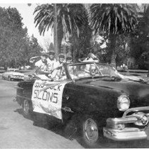 Group of boys in baseball uniforms riding on back of convertible sedan with top down. Sign on side of car says "Good Luck Solons. . .Senators." Probably part of a parade.