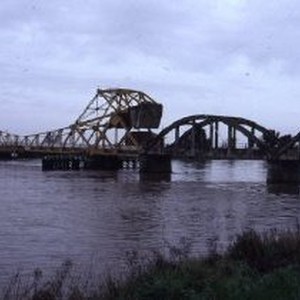 Sacramento River at flood stage passing under the Isleton Bridge.