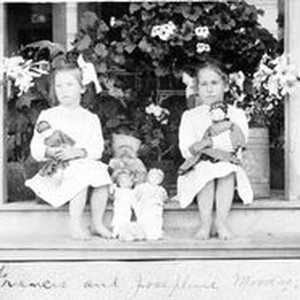 Photo--black and white: From Sebring / Allen album, Francis and Josephine Moody sit with their dolls on Mrs. Fairbanks porch (possibly in Santa Rosa).