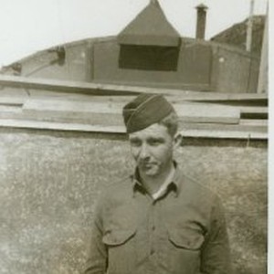SERIES. Ed Sayre poses in army uniform in front of quansit hut.
