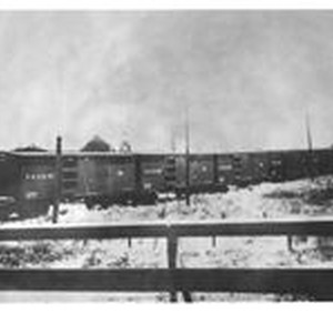 Photo,--black and white: Petaluma and Santa Rosa Electric Railway (P&SR). A string of P&SR RY cars being pulled by an engine. A fence in the foreground, electric poles on either side of train. A worker sits behind the engine and another man sits on top of the first car.