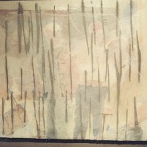 Photo of an abstracted painting that looks like people behind bars, on display at the Crocker-Kingsley Exhibition. In soft pastels.
