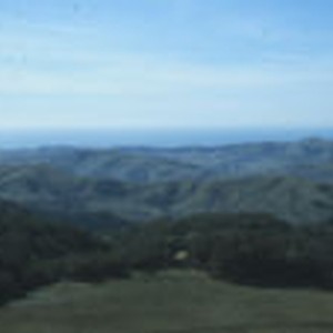 Looking down towards the ocean with a meadow in the foreground, and mountains in the background.