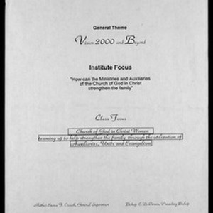 89th Annual Holy Convocation of the Church of God in Christ (COGIC), institute focus guide, "Vision 2000 and beyond: the church's ministry to the family", Memphis, Tennessee, 1996 November 6-9. [Description English/roman)]