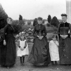 SERIES. Three women, three children and a man pose beside a house. Yard behind them.