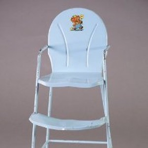 High chair, doll. Blue metal, with illustration of an elephant on seatback. ANSCO brand. c.1940s-1950s.