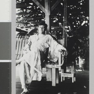 Jack London, wearing a kimono, sits on a wood bench outside on a porch shaded by an overhead trellis. Title transcribed from envelope. Biographical sources date this at 1915.