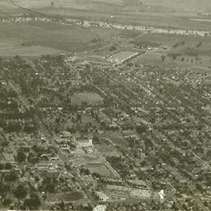 Aerial view of Sacramento looking north from Stockton and Alhambra Blvd. McKinley Park visible in center with the American River and North Sacramento beyond.