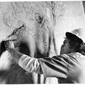 View of Michael Casey, a resident sculptor as he traces out a Griffin complete with wings and spitting fire. The bird is part of a large mural. (see image 3314) He is part of the team restoring the California State Capitol building.
