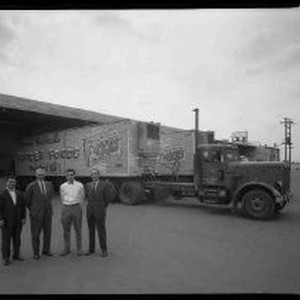 SERIES of four photographs showing the warehouse and trucking operations of United Grocers. One of the featured brands painted on the side of a truck is Bonnie Hubbard Frozen Foods.