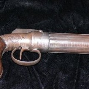 A double action 31 caliber, six-shot pepper box style pistol with ribbed barrel and bag shaped handle with walnut grip. Metal bears engraved floral design. Manufacturer's name "W. W. Marston & Knox New York" stamped on the barrel.