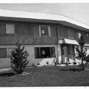 "Concrete fill was used between floors as soundproofing in this new 10 unit apartment structure at 43rd and Lakecrest Avenues. This is the Lakecrest exposure; the side facing 43rd has a swimming pool screened by a wall of concrete block. The apartments range in size from 710 to 920 square feet. Darrell Dettling, builder and owner, estimates construction cost at $80,000. The architect was Melvin R. List of Sacramento"