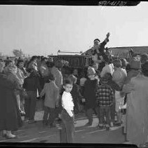 Image / A crowd of people looking at Santa Claus on a fire truck