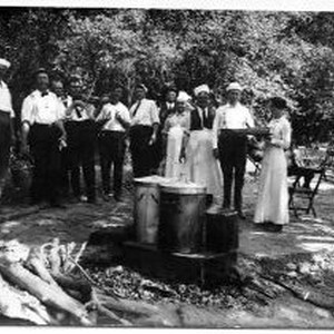 Nine men and two women, one of whom is holding a tray, standing in the shade at a picnic. One of the men has a fiddle and two of them are wearing chef's caps. There are two large metal containers in the foreground, and chairs and a table with women in the background.