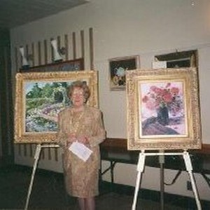 An unidentified woman stands by two paintings, displayed on easels. Other paintings hang on the wall in the background. On the back is written in ink: "3-4-95, 3-4-95, #20, 45." Photograph removed from Scrapbook, 1993-1997, 2003/051/010.
