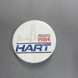 Black/red/blue text on white background. "Democratic Convention 1984 HART" (Senator Gary Hart) w/image of bridge