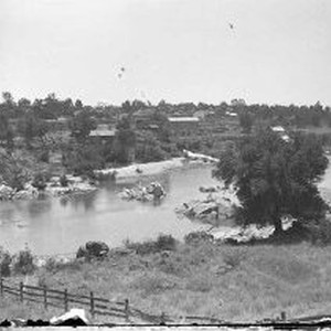 American River at Folsom, across the river is the Folsom Powerhouse and the town of Folsom. Just to the left out of the photo is a bridge.