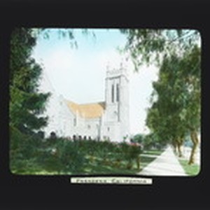 Glass photographs -many in color- of Southern California scenes. They include Pasadena views (homes, a school, a church), Mt. Lowe, poppy fields, sunset over the Pacific, San Gabriel Mission, Catalina Island, Los Angeles (Eastlake Park), hauling cotton in Imperial Valley, San Luis Rey arches, headwaters of Owens River. A Pasadena home.