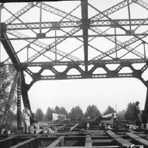 View of workers standing on beams that are in place to eventually support the bridge surface. Steel supports have been erected overhead.