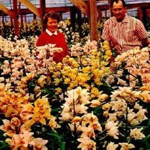Man and woman stand in midst of greenhouse full of orchids. "Cymbidium orchids blooming in springtime at Shaffer's Tropical Gardens, Inc. 1220 41st Ave., Santa Cruz, Ca. From the Santa Cruz-Watsonville Freeway turn on 41st Ave. toward ocean, one mile."