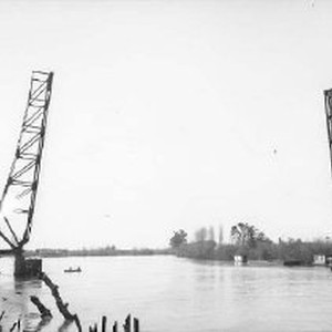 View up the Sacramento River with drawbridge under construction on both sides.