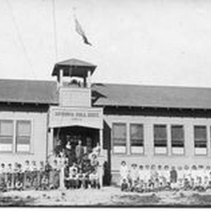 Photo--black and white: The 'new' 1914 2-room Spring Hill school building, about 1914, with students and teachers in front of the school.