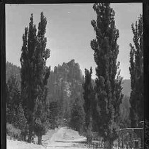 A mountain view with a road lined by poplar trees with large rock formation in the background; at the right corner is the porch of a rustic building. Handwritten in the lower right corner "Frederick Foto 8". Original container marked "Tahoe Views Donner"