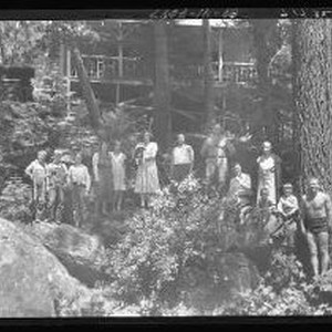 An unidentified group of people standing in front of a cabin in a forest setting. A handwritten date on the negative 7-17-32.